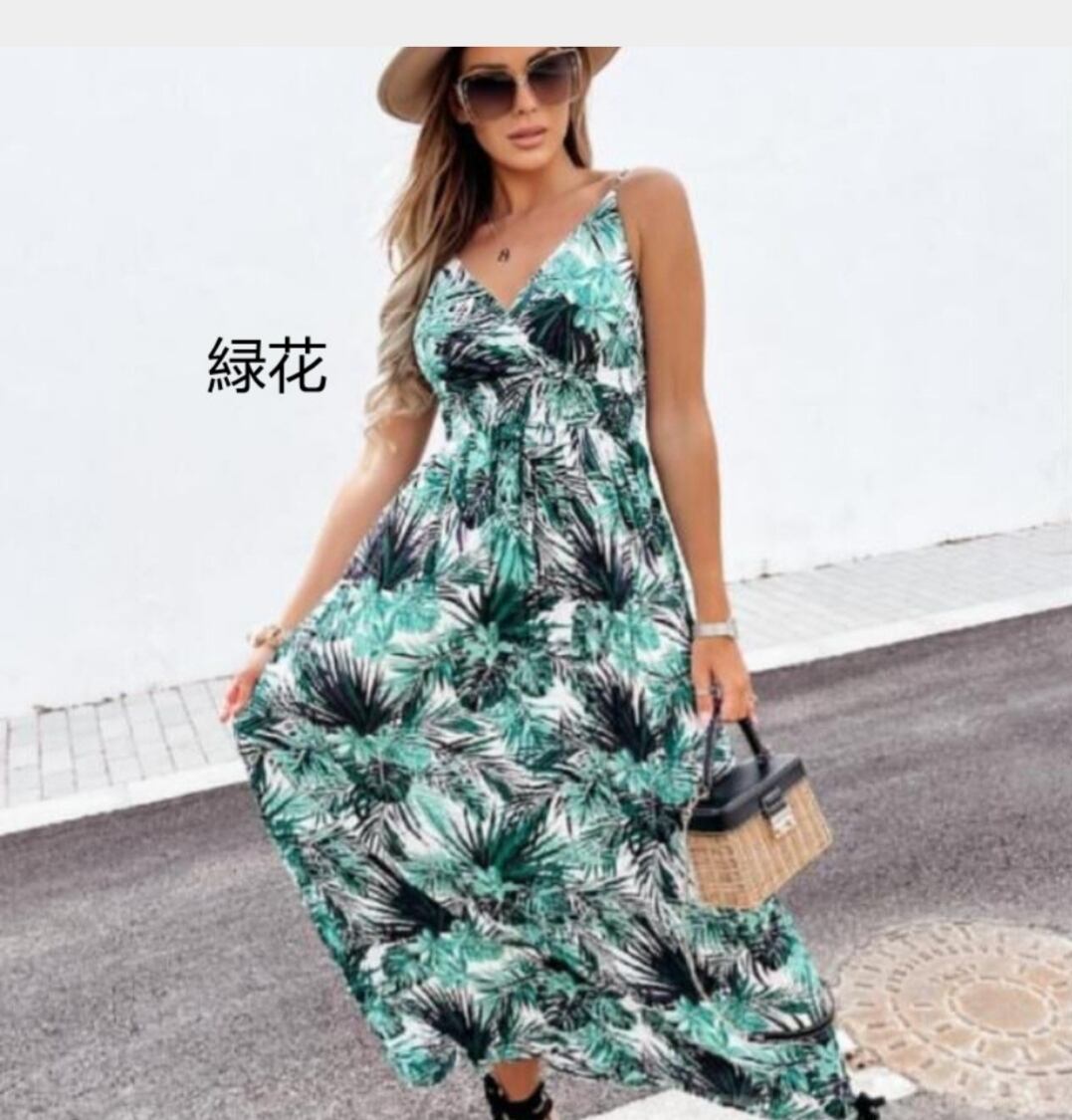 ボヘミアン キャミソールワンピース ボタニカル柄マキシ丈ワンピース リゾート