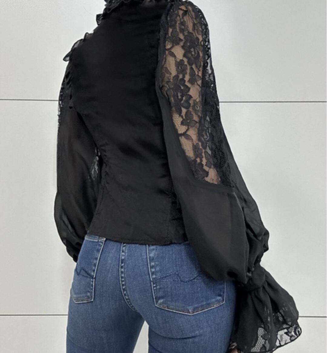 レディース シャツ 長袖 ハイネック レース 暗黒系 シースルー ヴィンテージ フリル