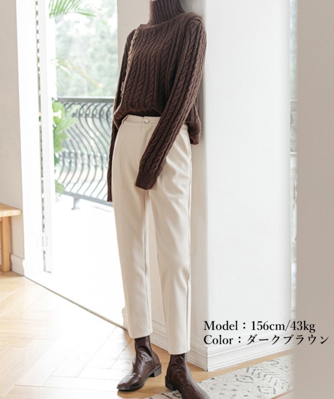 タートルネックが首元を暖かく包み込み、寒い季節に最適です。