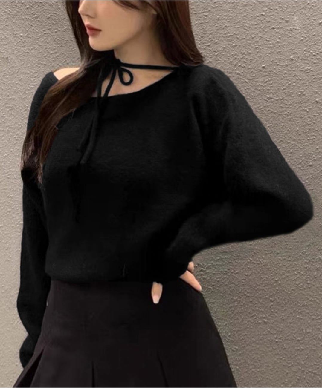 片側がオフショルダーになったアシンメトリーなデザインで、フェミニンかつセクシーな雰囲気を演出。