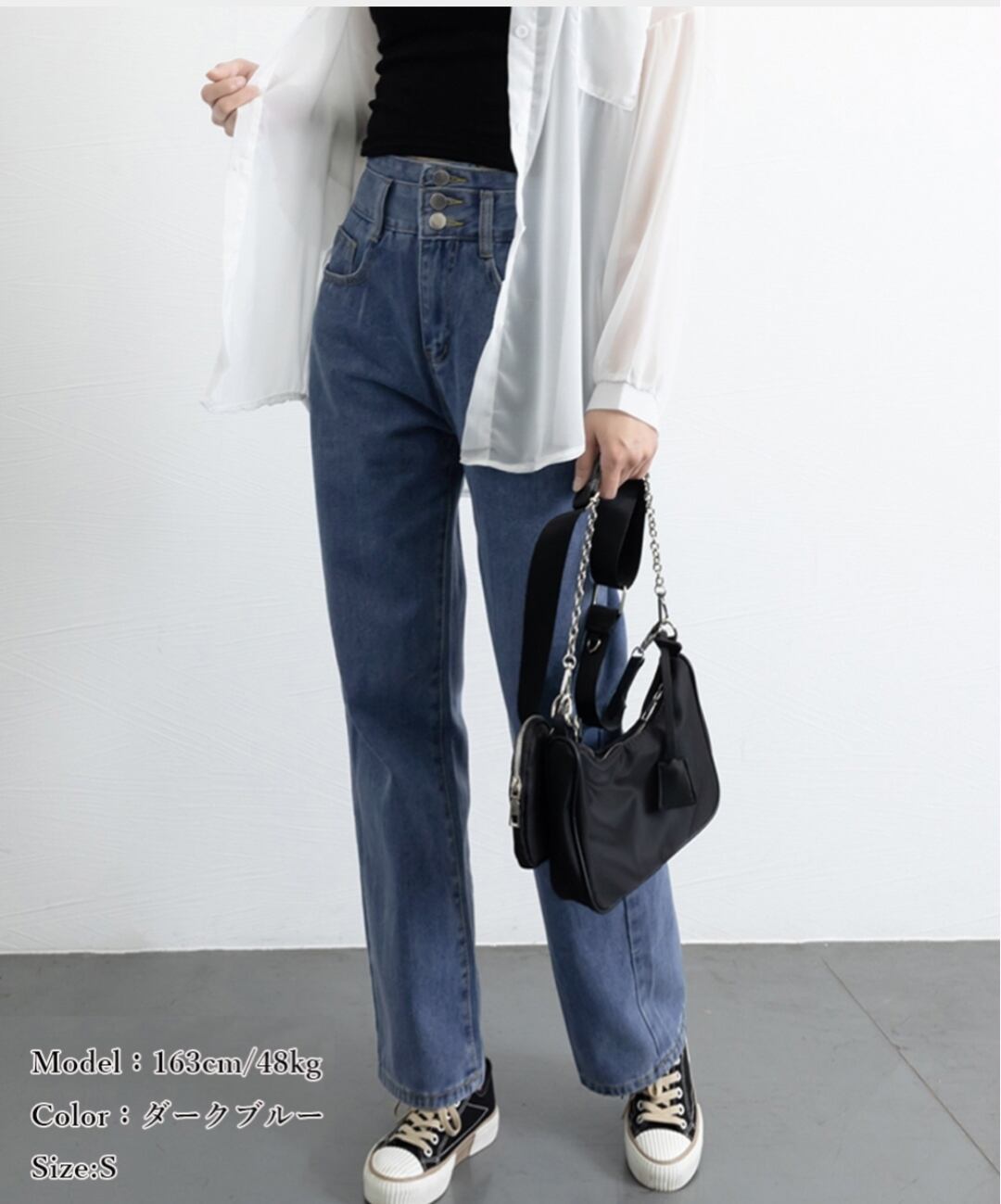 美脚ストレートパンツ 着やせ セミワイドパンツ ボタン付き ジーパン 高く見え ロングズボン オシャレ カジュアルパンツ