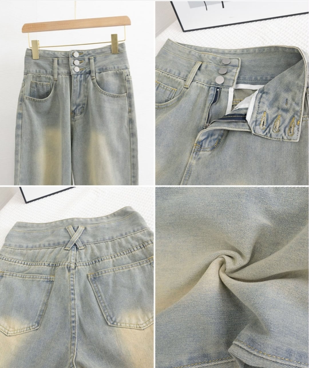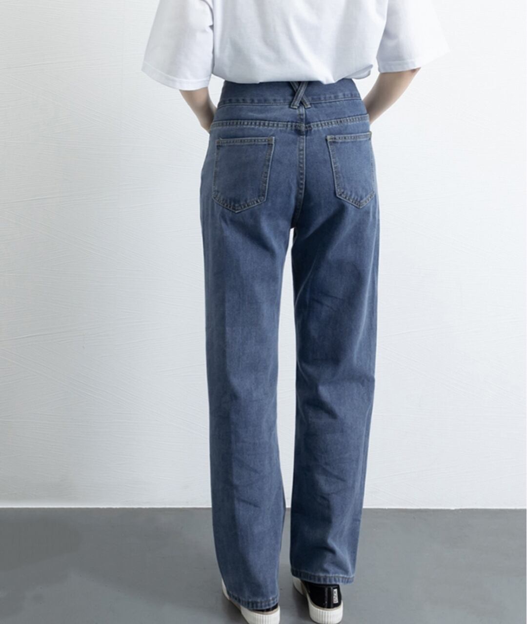 ウエストボタンは3つ付き、美脚シルエットにこだわった大人のハイウエストデニムパンツ。