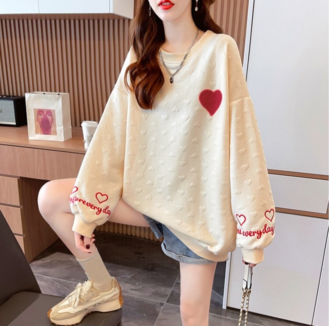 カジュアル ラウンドネック ロゴトレーナー エンボス加工 長袖プルオーバー ハート刺しゅう 体型カバー ロンT 春秋服