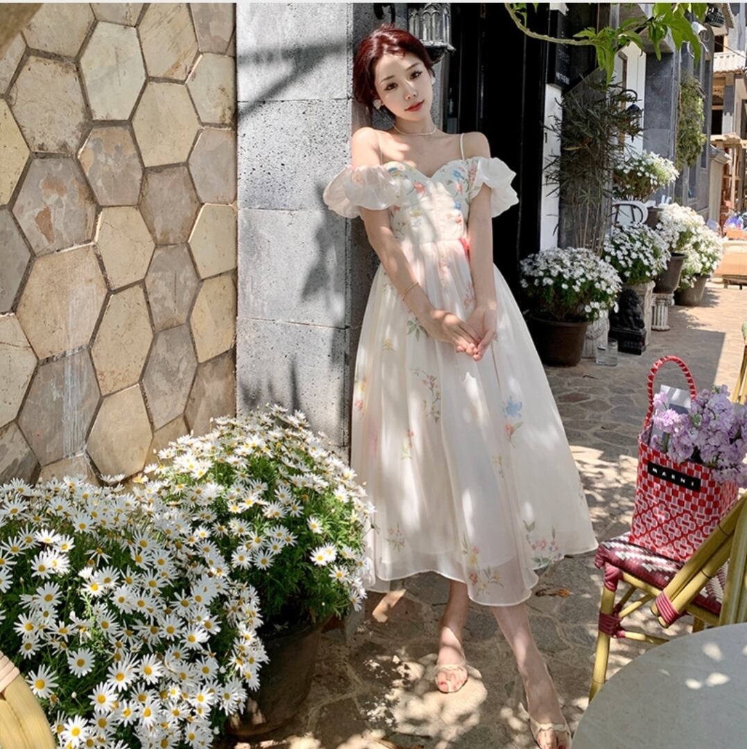 花柄ワンピース オフショルダー パフスリーブ キャミソールワンピース フレアワンピース ロングワンピ