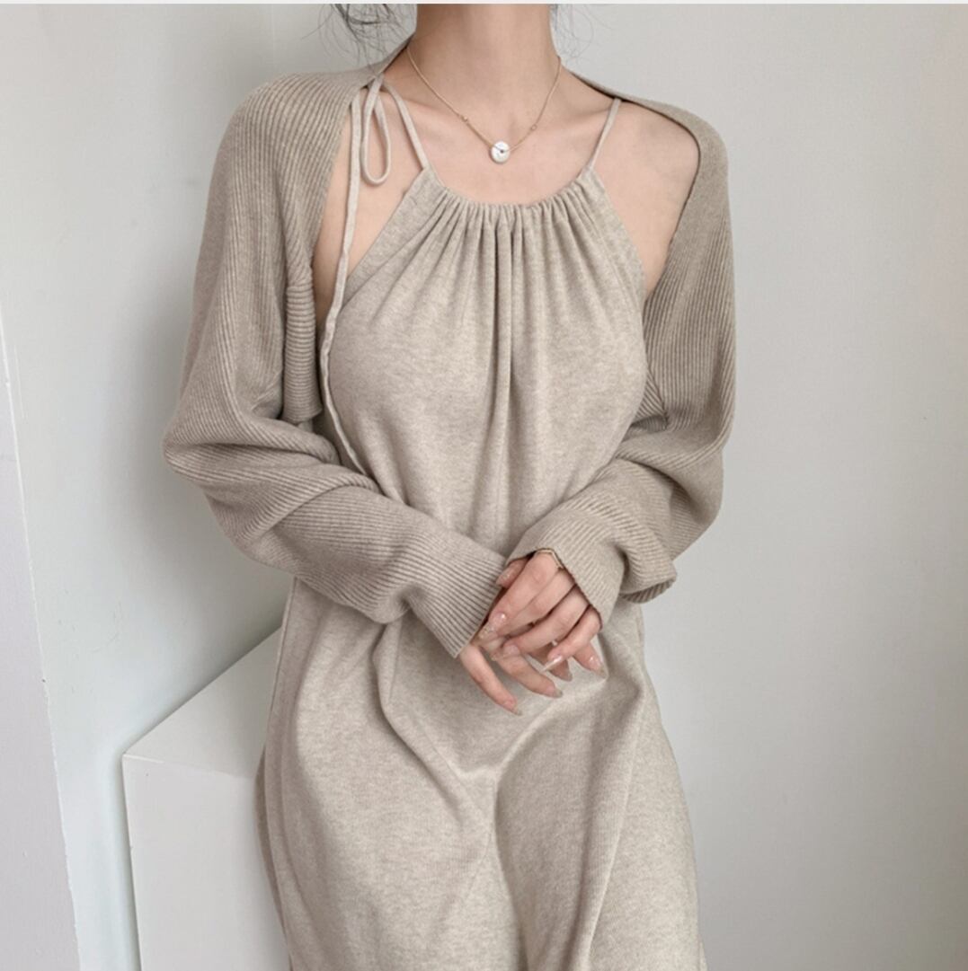 セクシーなニットワンピース+ショートカーディガンの2点セットアップ