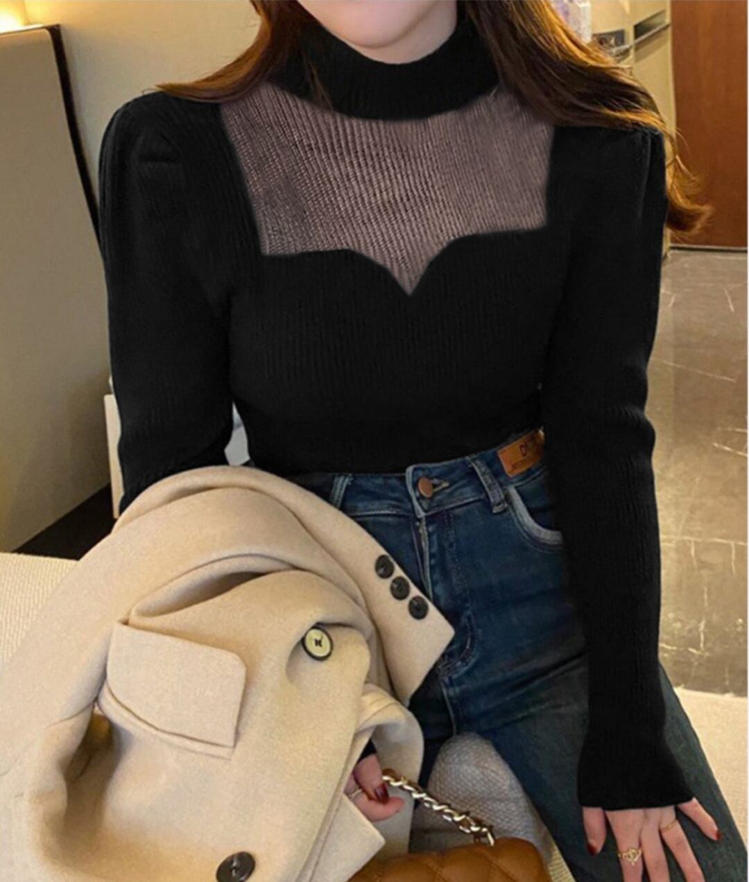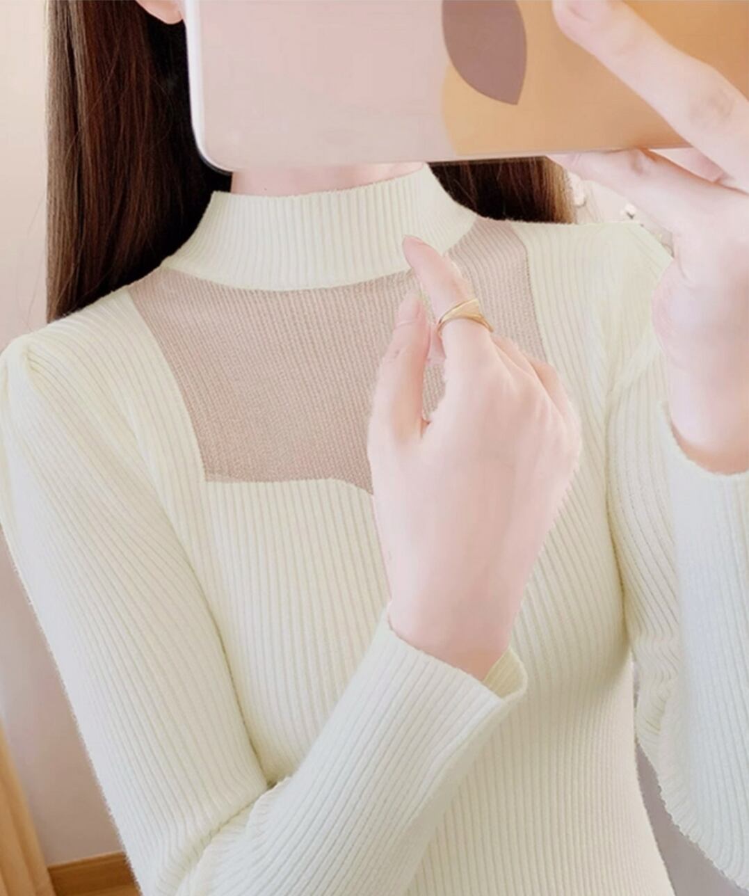 胸元シースルー リブニットプルオーバー 肌見せ 春秋冬ニットウェア 着回し きれいめ オルチャンニットインナー セクシー