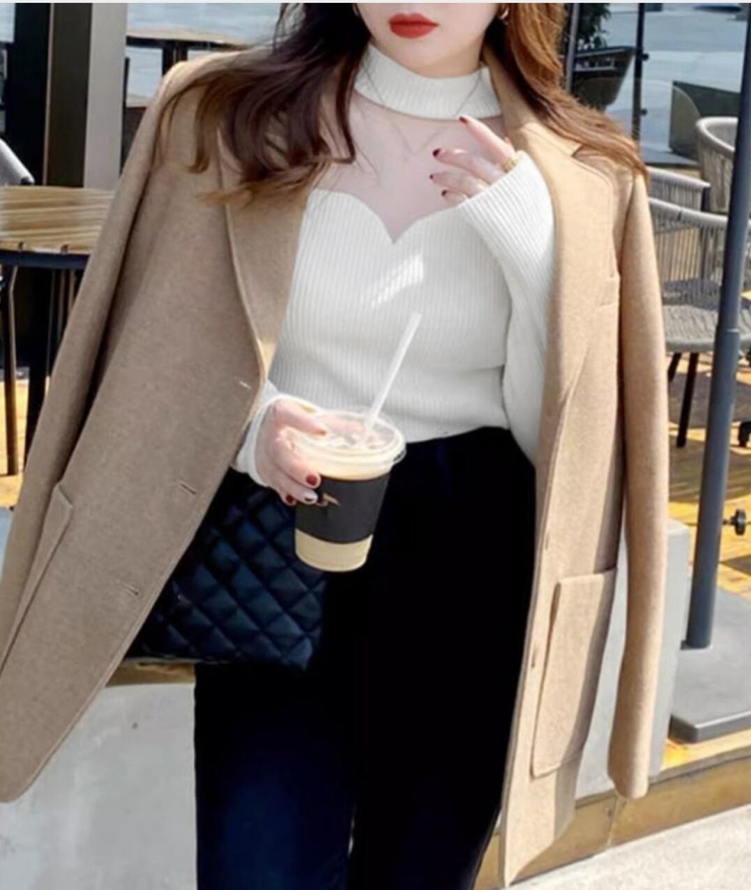 プチハイネックになっているので、小顔見せはもちろん、一枚で旬なコーディネートが完成