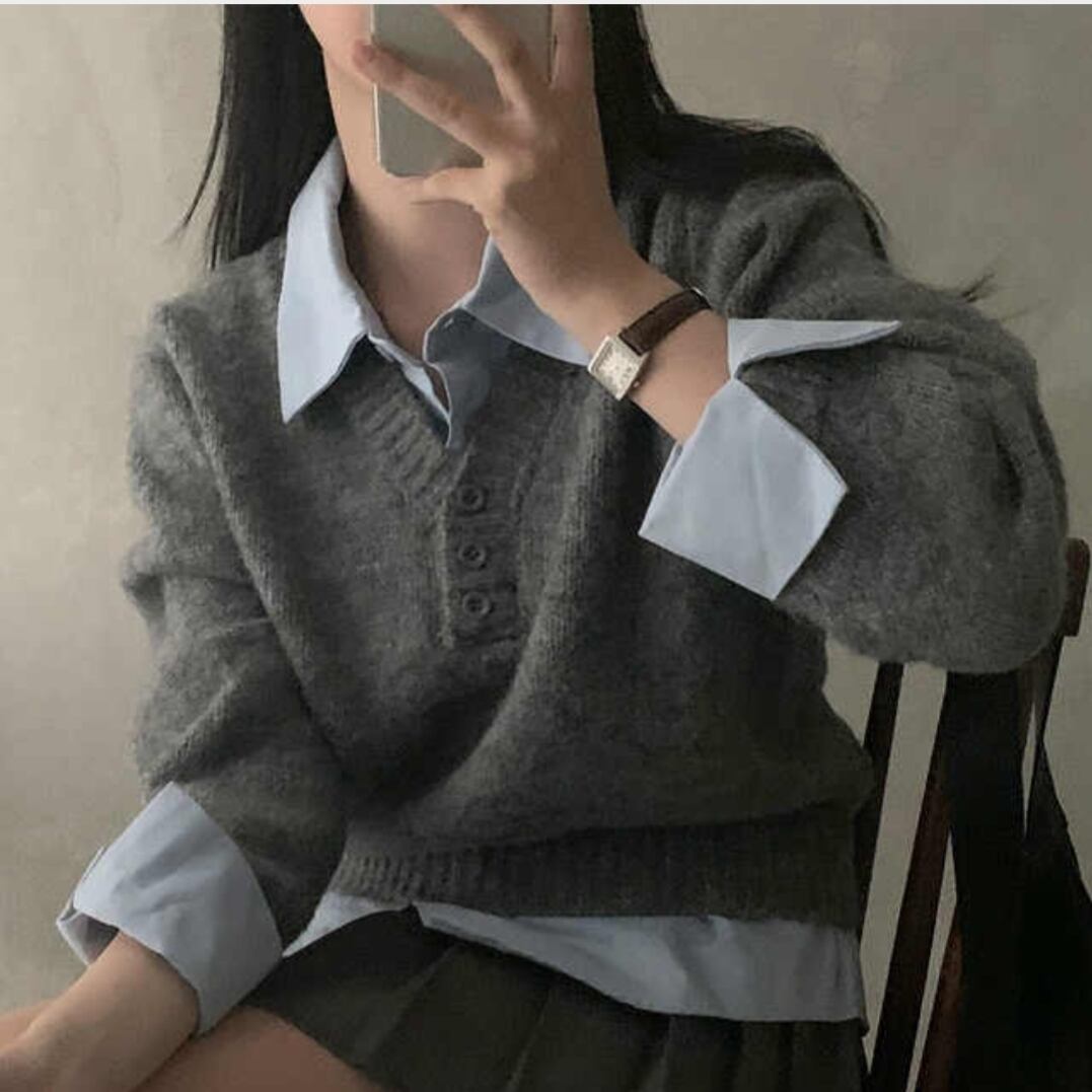 おしゃれ トップス 折り襟 フェイクレイヤード ニット chic 韓国 ファッション