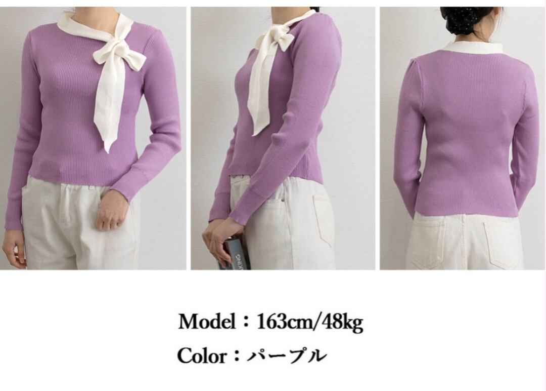 ネックラインのリボンデザインがアクセントになり、エレガントな印象を与えるアイテムです。