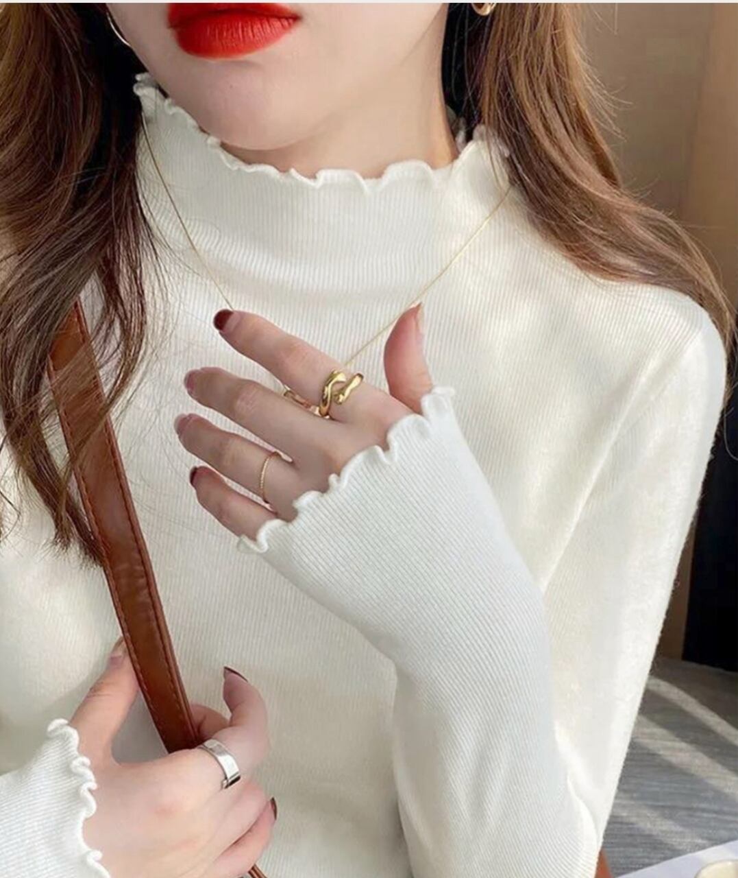 襟や袖のメロウフリルが、レイヤードコーデのアクセントにぴったり