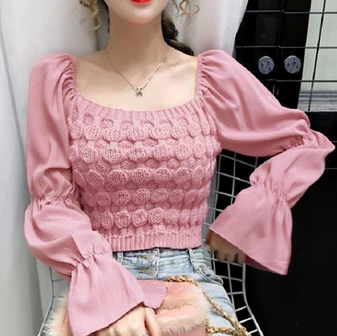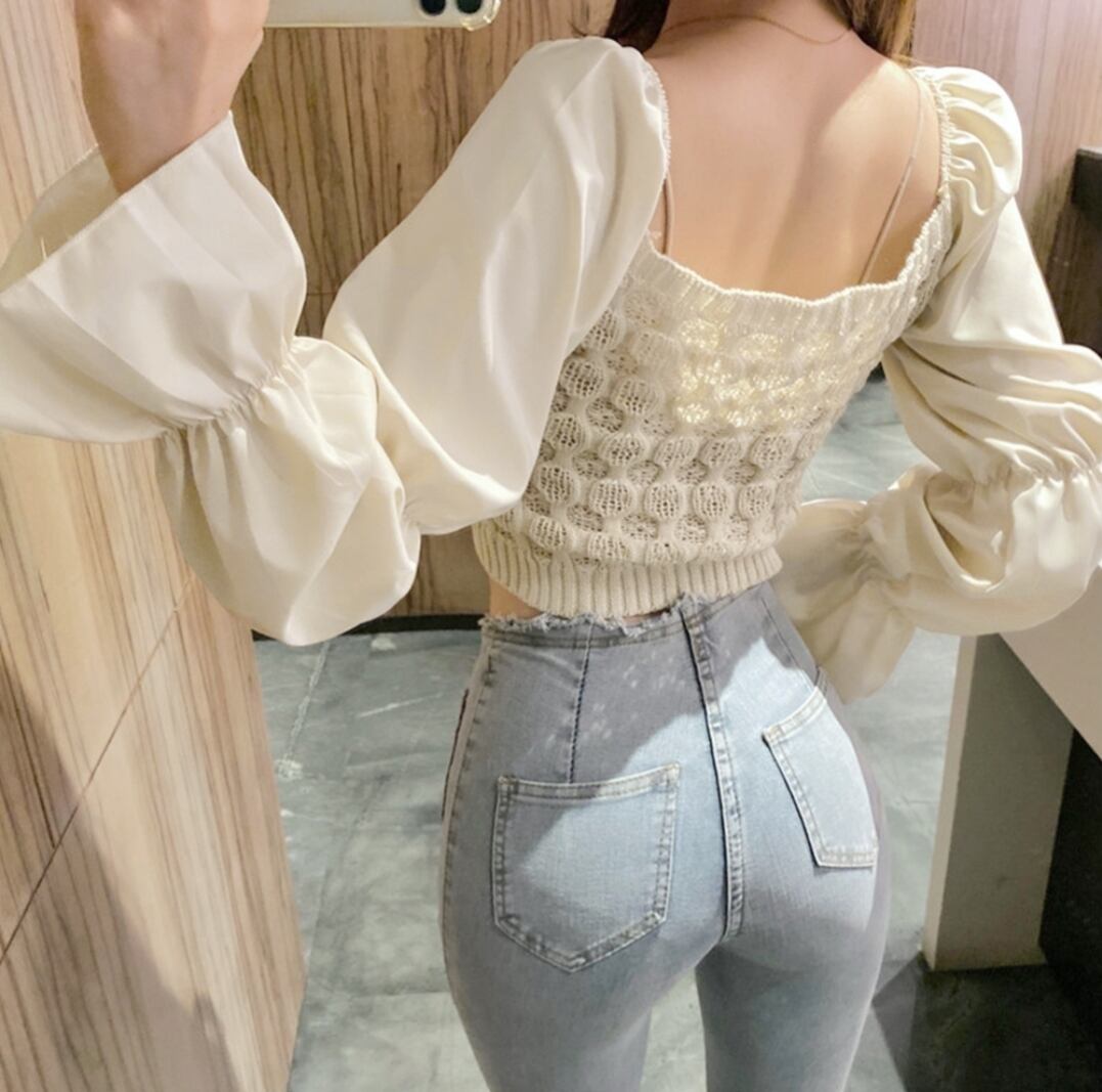 シャツブラウス スクエアネック レディース 長袖 ショート丈ニットトップス