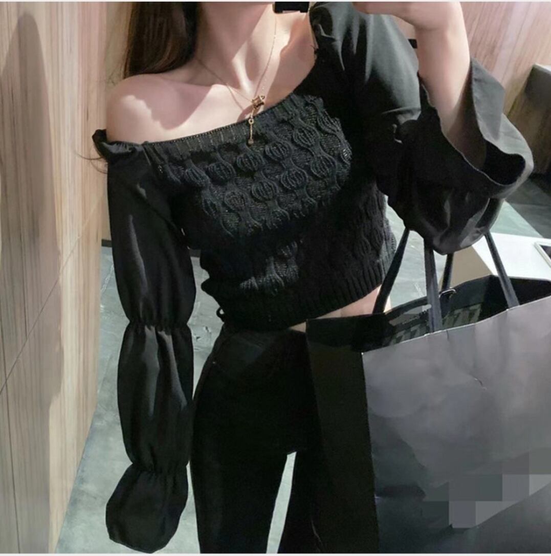 ドッキング異素材春/肩出しニット着やせ/オフショルニット