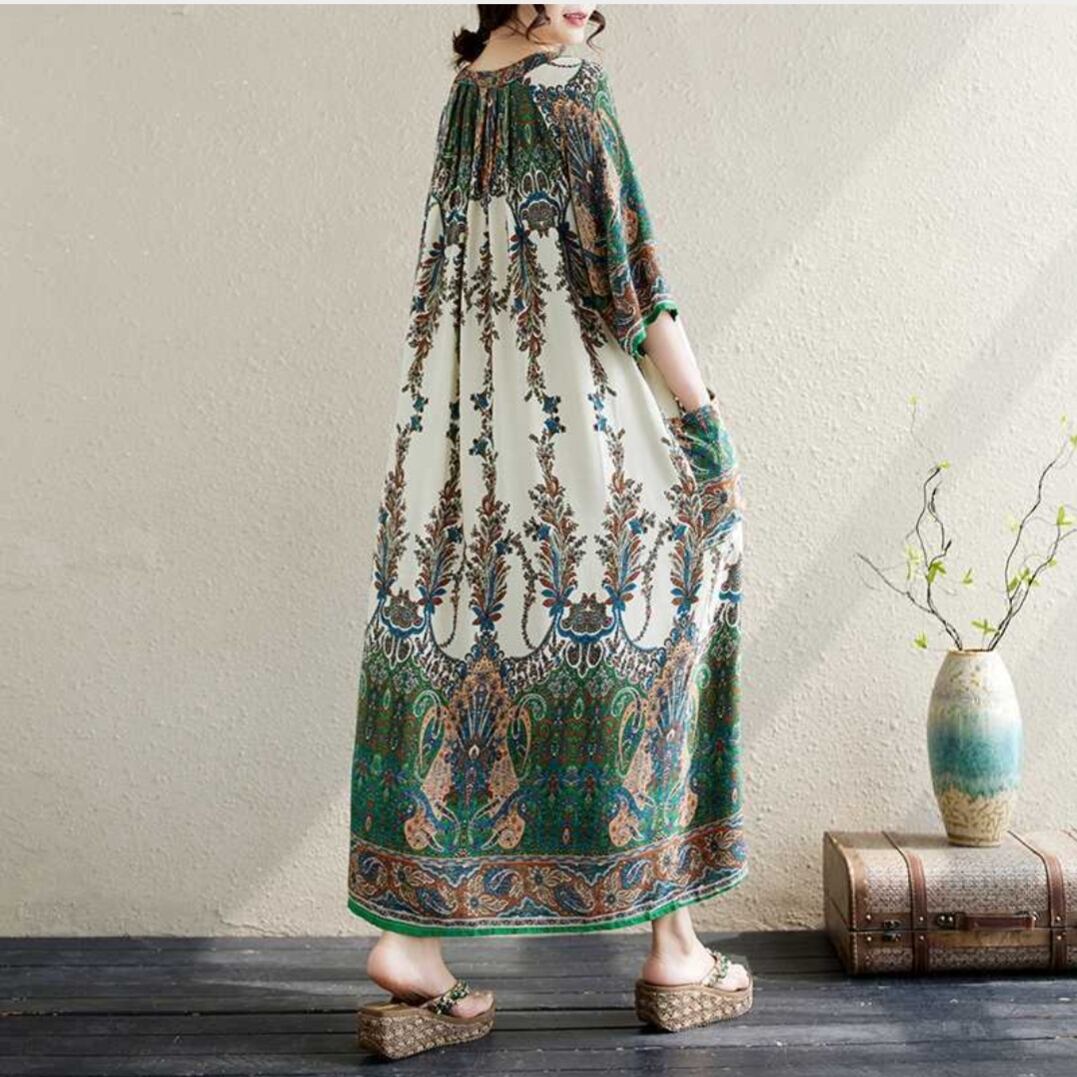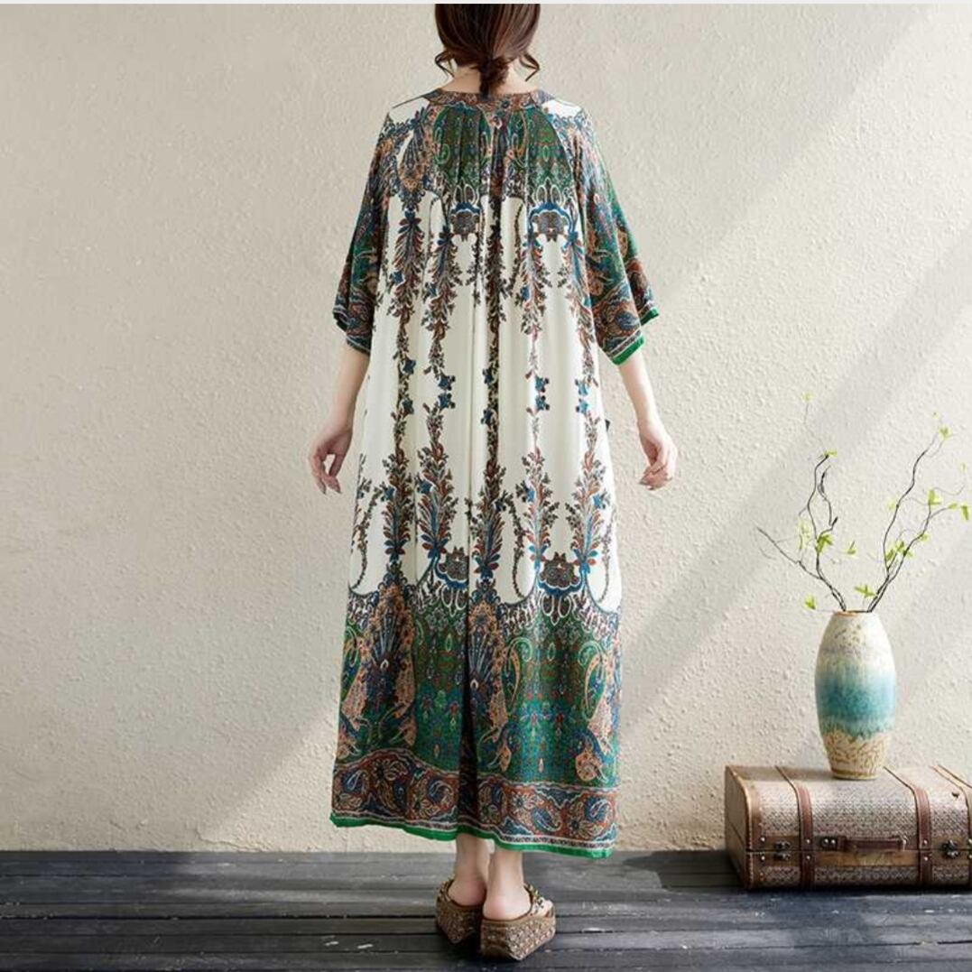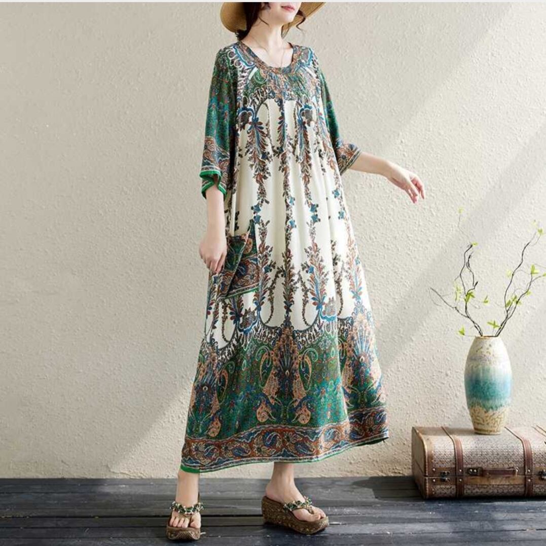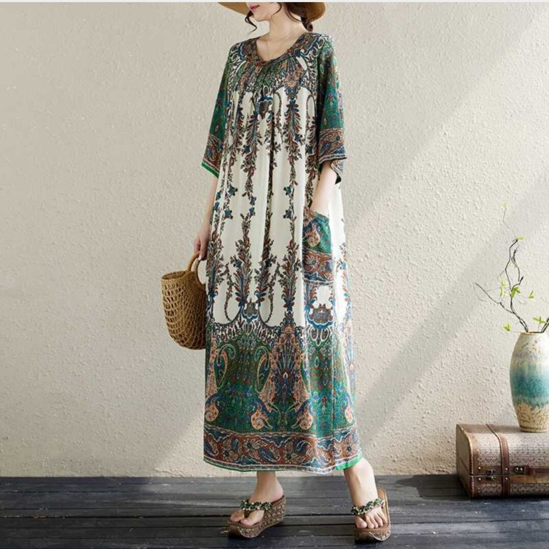 レディース花柄デザイン半袖ロングワンピースカジュアル