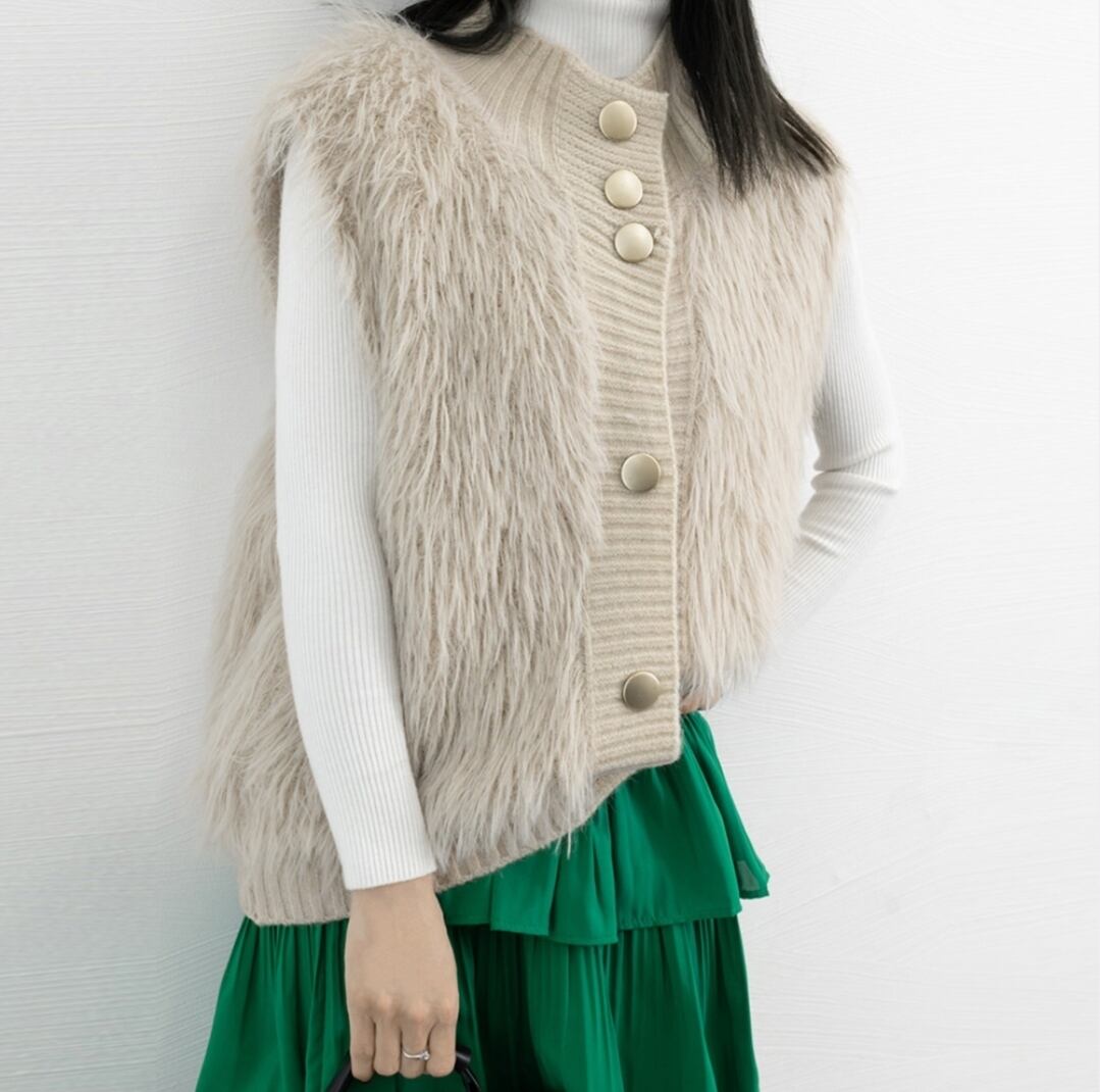 韓国 ファージレ きれいめ スタンドカラーファージャケット 袖なしファーカーディガン 秋冬 ニットアウター 羽織り着やせ