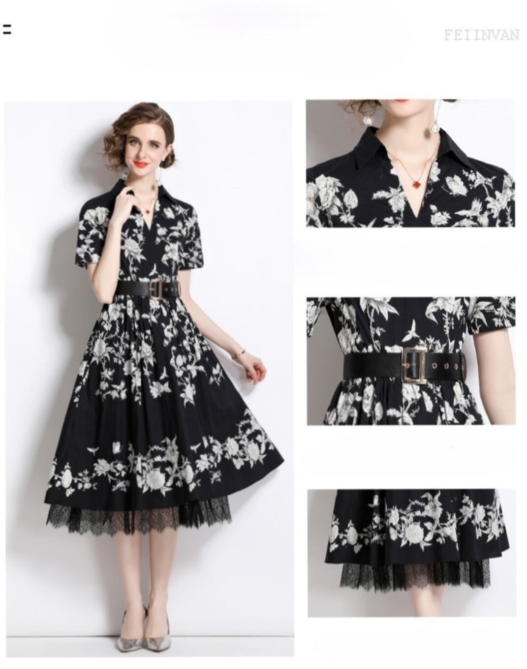 オシャレプリント裾レース切替ワンピース レディース 半袖 エレガント