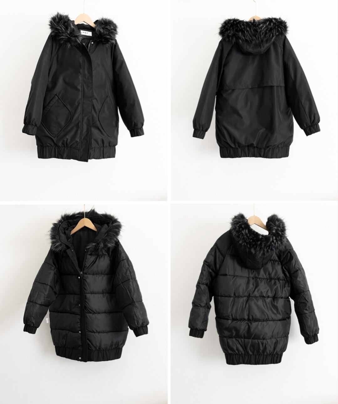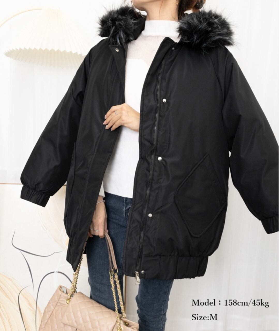 フードについているエコファーは取り外し可能なので、ゴージャスにもスッキリにも簡単にアレンジ可能