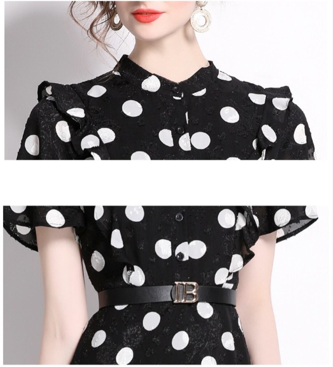 オシャレ水玉ベルト付きワンピース レディース 半袖 エレガント