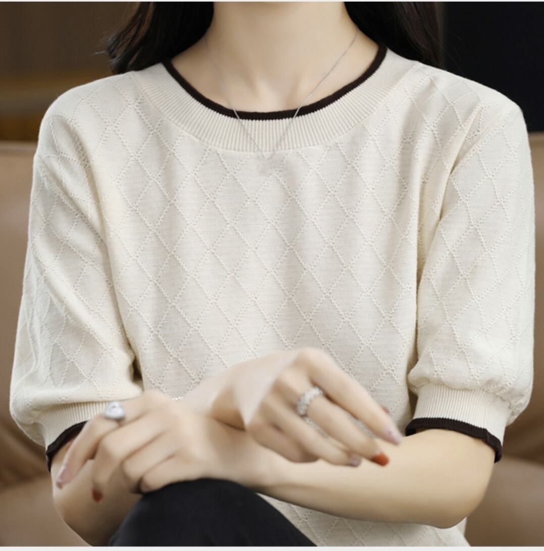 丸襟ニットひし形柄/ニットTシャツ通勤/シンプルニット無地