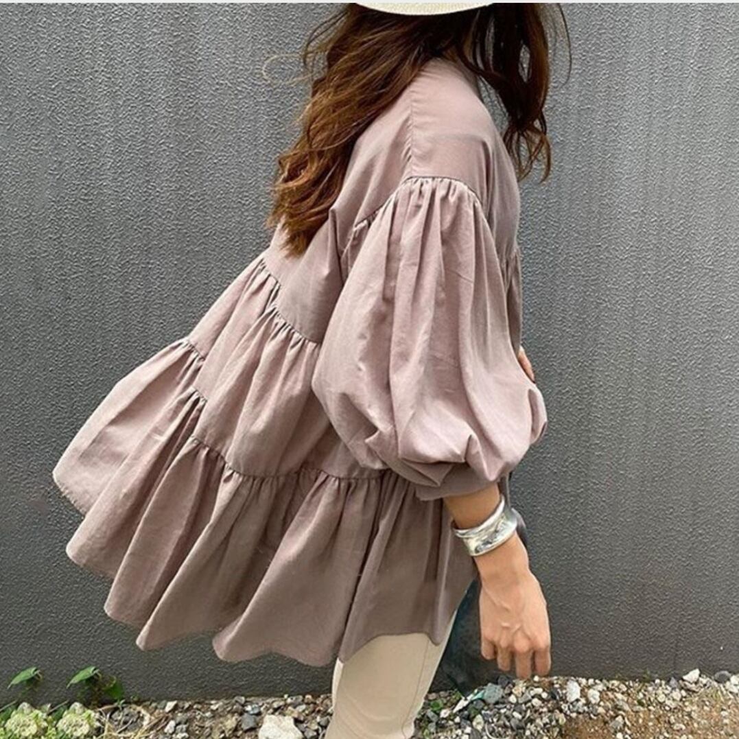 ブラウス 人気シャツ ラウンドネック 両面着 体型カバー フレア レディーストップス 全7色