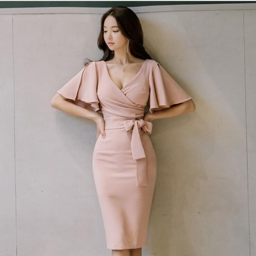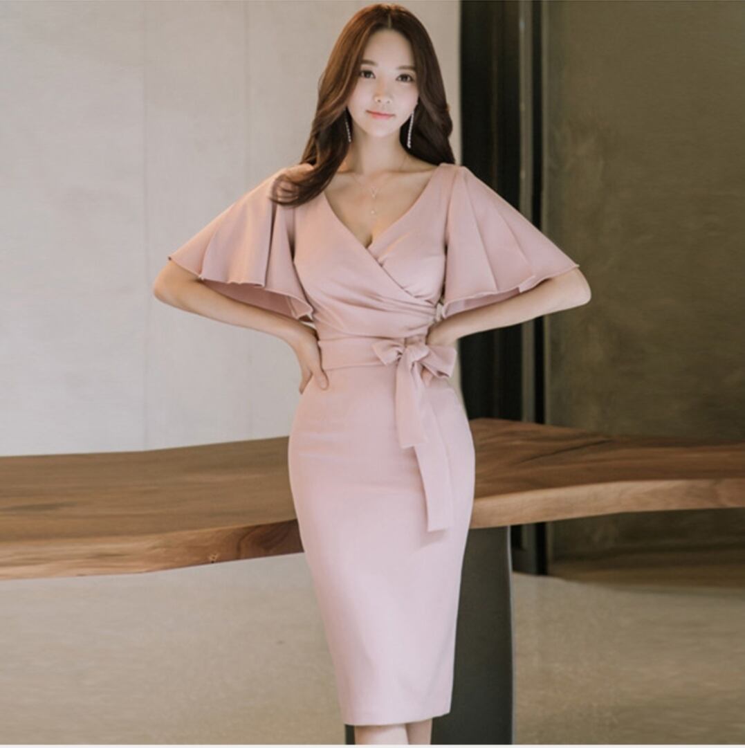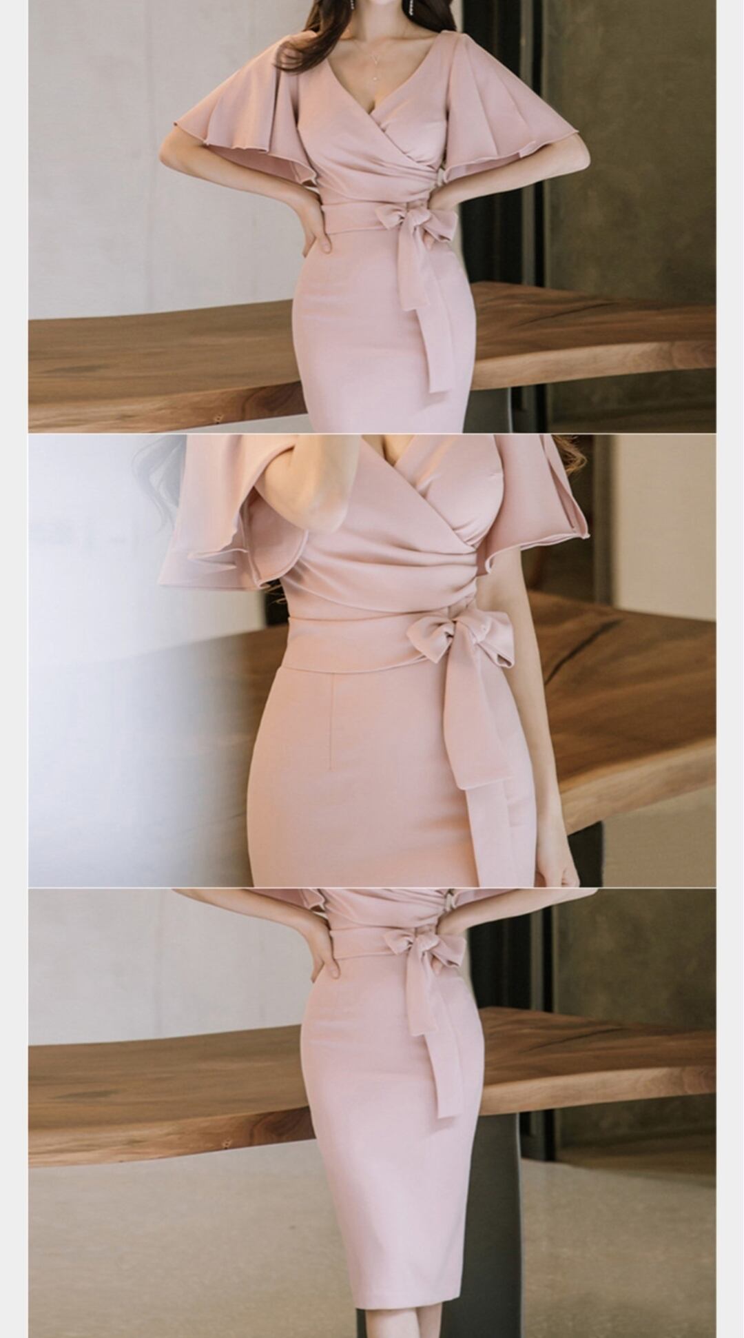 ワンピース 半袖ドレス Vネックワンピース スリット入りワンピース ミディアム丈 膝丈 蝶結び レースアップ