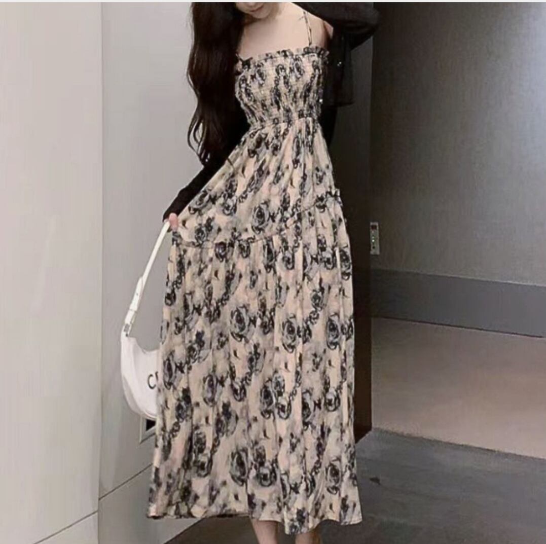 ワンピース レディース マキシ丈 ロングワンピース 花柄 レトロ キャミ紐 柄 キャミワンピ
