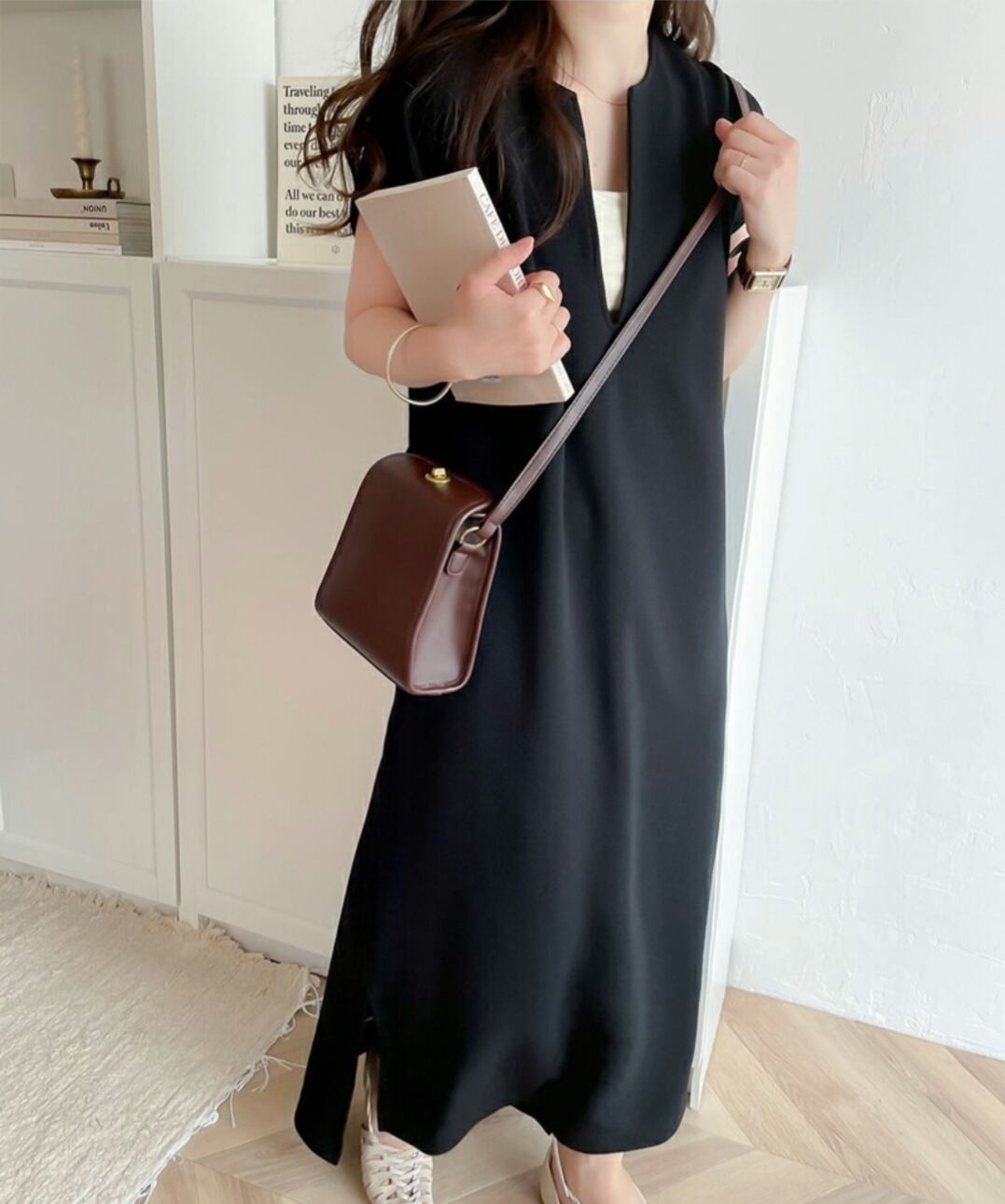 ・デコルテをきれいに見せてくれる深めのキーネックデザイン。