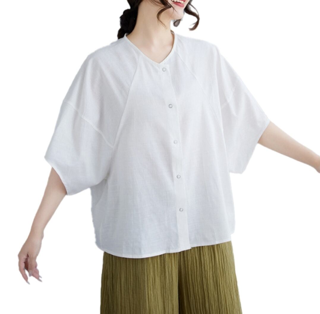 シャツ レディース ブラウス トップス 綿 麻 チュニック おしゃれ リネンシャツ 七分袖 ノーカラー 薄手