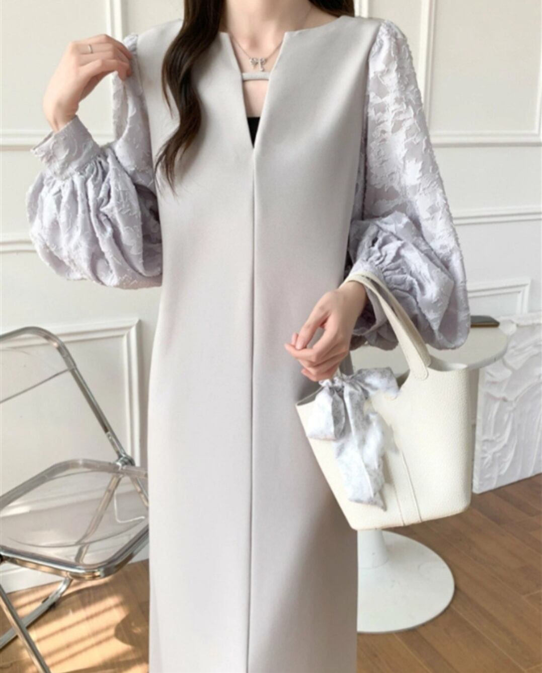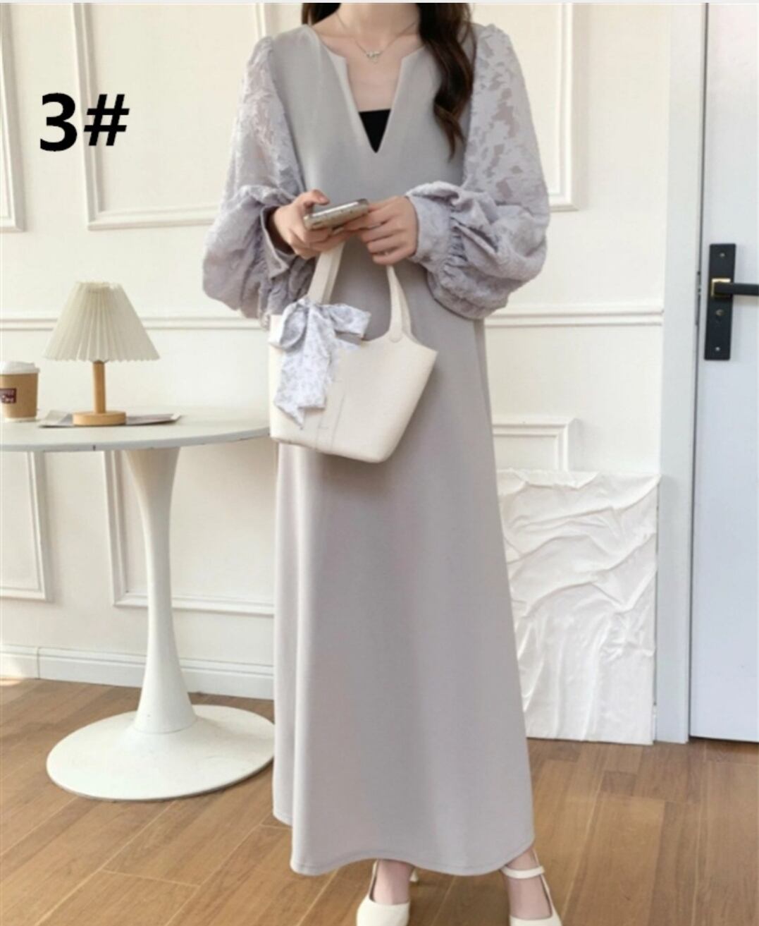 ワンピース レディース ロング丈ワンピース 長袖 異素材 Vネック レース 気質 きれいめ