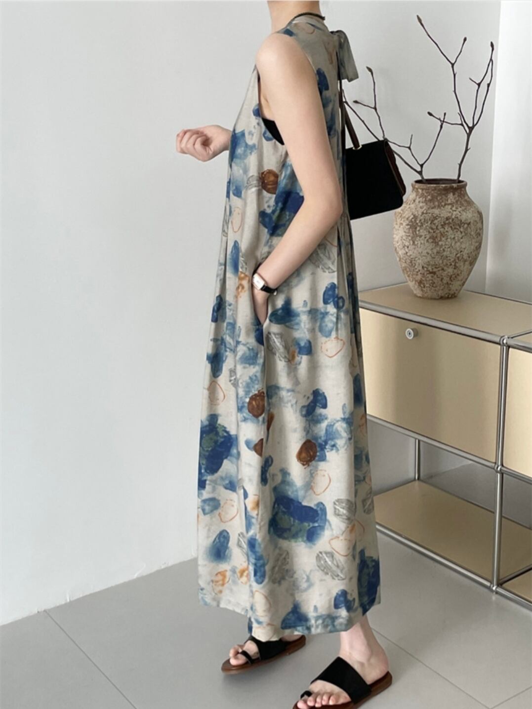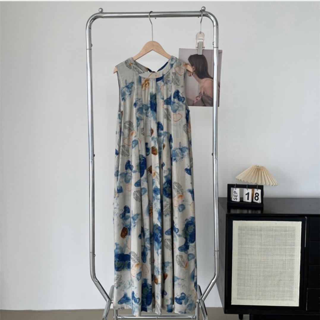 【墨絵晕染バックリボン付きプレスプリーツ無袖ロングドレス】おすすめのアイテムが登場!
