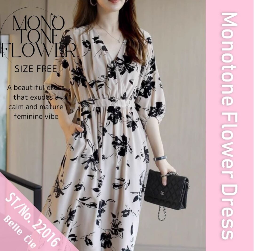 ワンピース ミモレ丈 ミディ丈 7分丈 総柄 モノトーン フラワー レディース 韓国ファッション