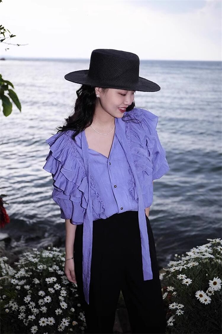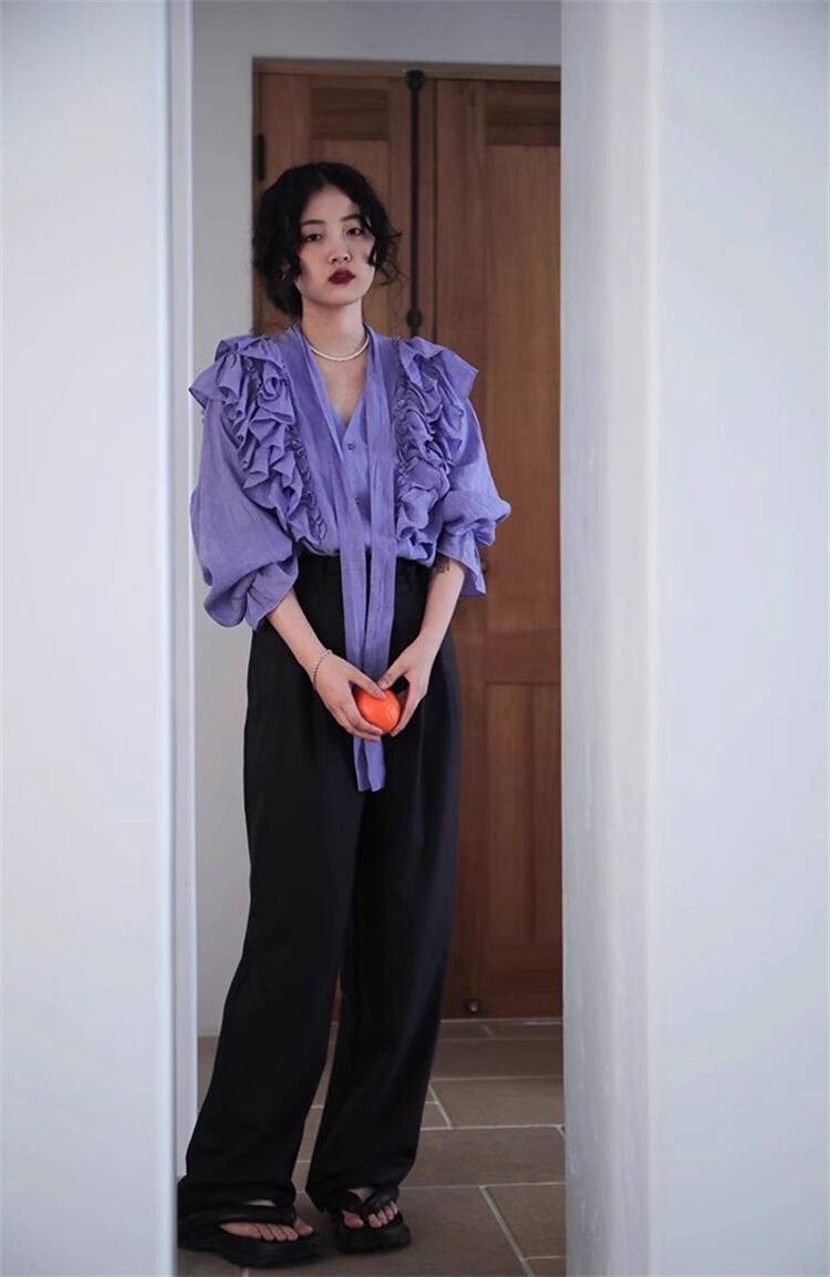 持つだけでお洒落度UP レトロフリルVネックシャツ ゆったりオーバーサイズ おしゃれトップス レディース