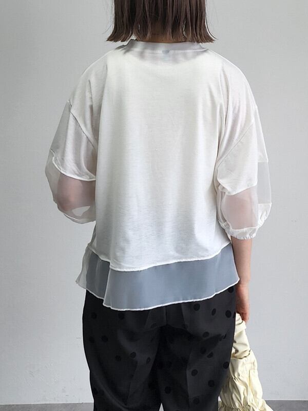 2025新作 異素材 Tシャツ フレアtシャツ オーガンジー 半袖 パフスリーブ レディーストップス 可愛い