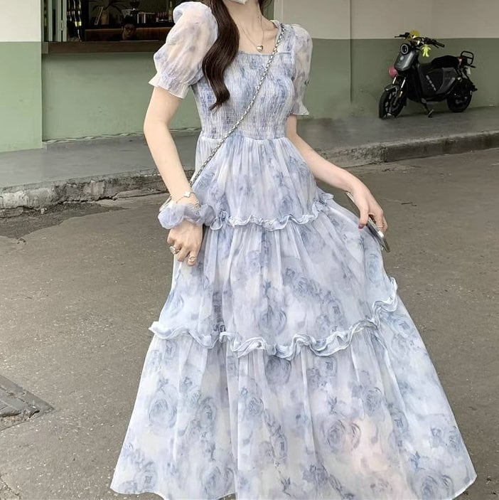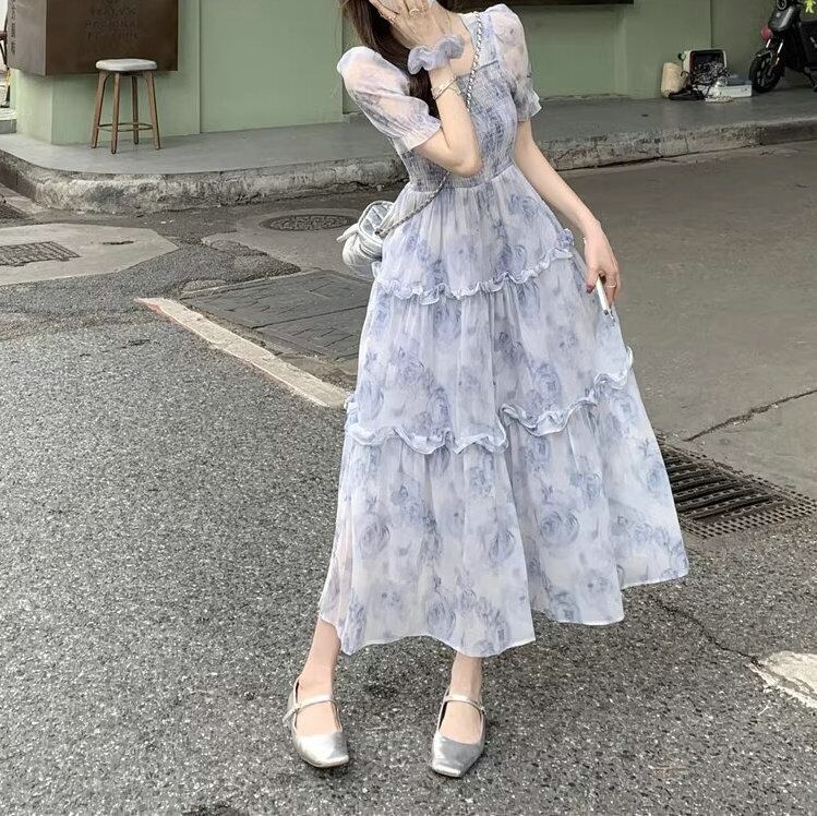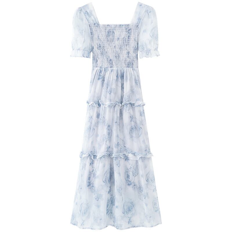 花柄ワンピース シフォンワンピース レディース 春 夏 秋 半袖 マキシ ロングワンピース シャーリング 綺麗